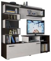 Оригинальные открытые полки, на которых можно разместить фотографии, предметы декора или любимые книги, представляют собой единую ломаную линию, удобная зона под ТВ, вместительная ниша, скрытая створкой в цвете лоредо.